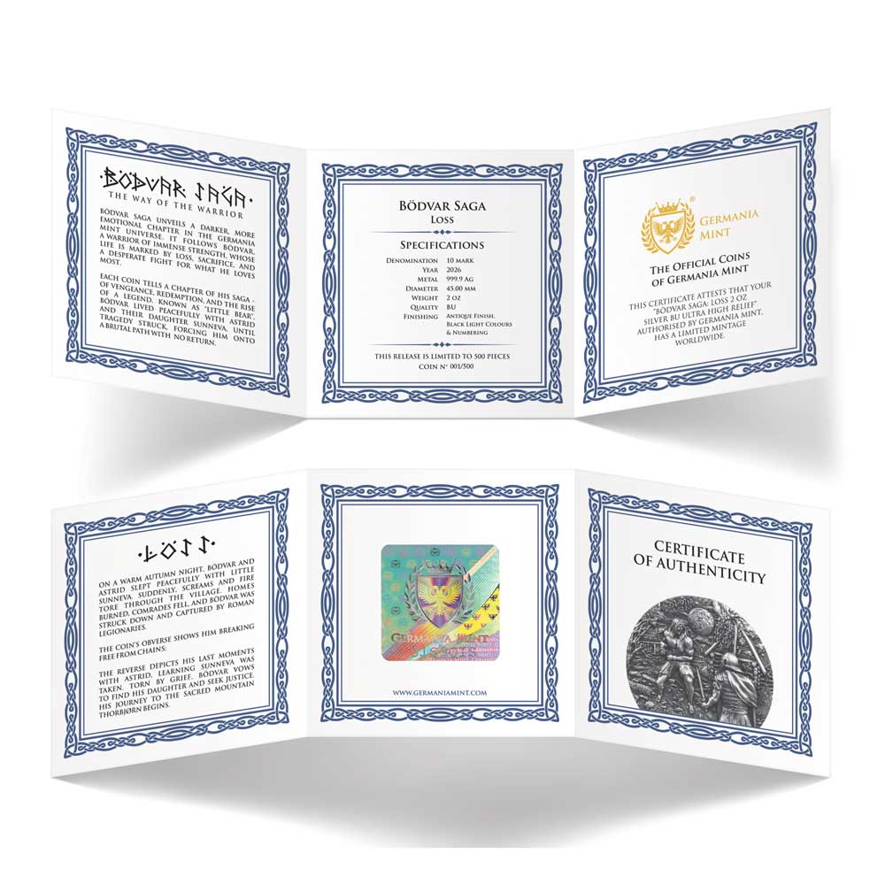 The series maintains a raw, dramatic tone – yet its essence is one of endurance, inner strength and unbreakable spirit. The coin 2026 Bödvar Saga: Loss 2 oz Silver BU Ultra High Relief opens an epic story about the path of a warrior leading toward the sacred mountain Thorbjørn.