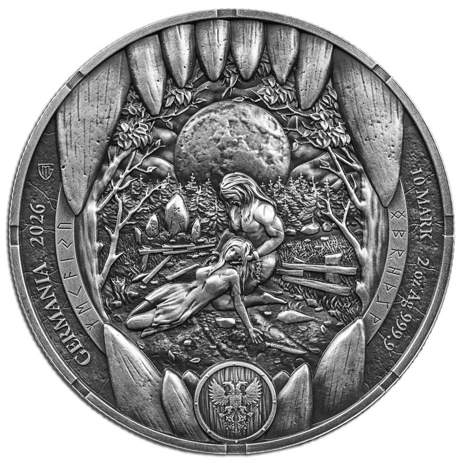 Each coin in the series presents the next stage of Bödvar’s journey. The obverse captures the key scene of the chapter, while the reverse continues the theme through the signature Germania design: a small shield with a double-headed eagle, runes and a distinctive frame of bear teeth. With every release, the shield accumulates new marks of battle – just like the warrior who carries it.