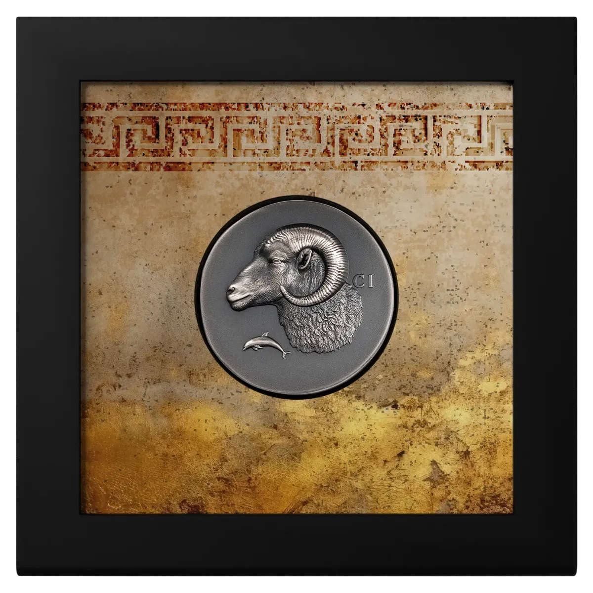 The image depicts a ram’s head. In ancient Greece, this symbolized strength, sacrifice, divine protection, and fertility. It was also a common sacrificial animal in religious rituals. A ram sacrifice was considered particularly valuable and was often offered to important gods. The ram was also often found on rhytons. A rhyton (Greek rhýein = “to flow”) is an ancient conical drinking vessel, very often in the shape of an animal’s head.