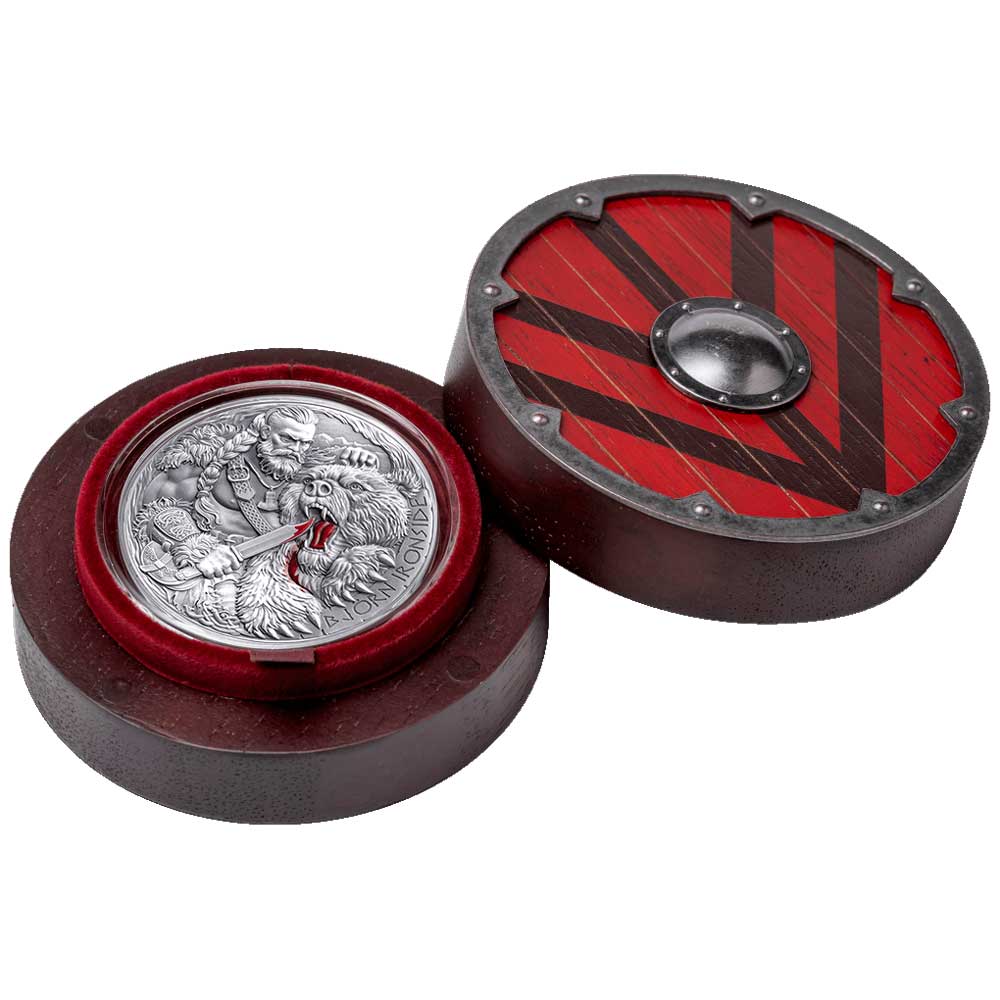 A fearless warrior, born of Ragnar Lothbrok’s bloodline, Björn Ironside forged his name into the sagas of valor and glory. Legend has it that his body was so strong, no enemy blade could ever pierce it. This striking 2-ounce high-relief coin captures Björn in a ferocious clash with a bear. Blood flows, yet he stands undaunted, mastering the wild with warrior’s will.