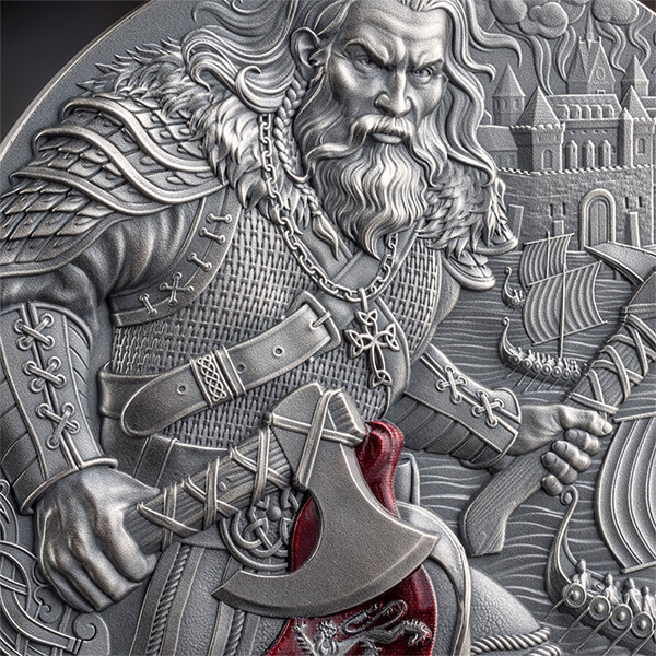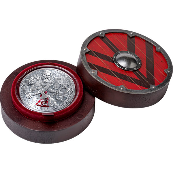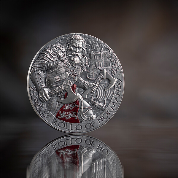 Struck from 2 ounces of .999 fine silver in antique finish, the coin reveals Rollo’s commanding presence in high relief, with digital printing adding vivid detail to his warrior’s attire. Every feature embodies his indomitable spirit and vision as both conqueror and statesman.